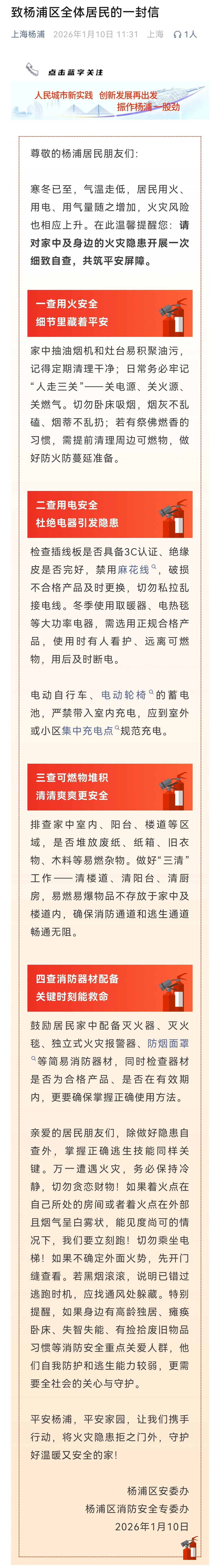 连日来,上海徐汇、黄浦、普陀、杨浦、嘉定、奉贤陆续发布致全体居民的一封信,提示注意冬春时节消防安全。